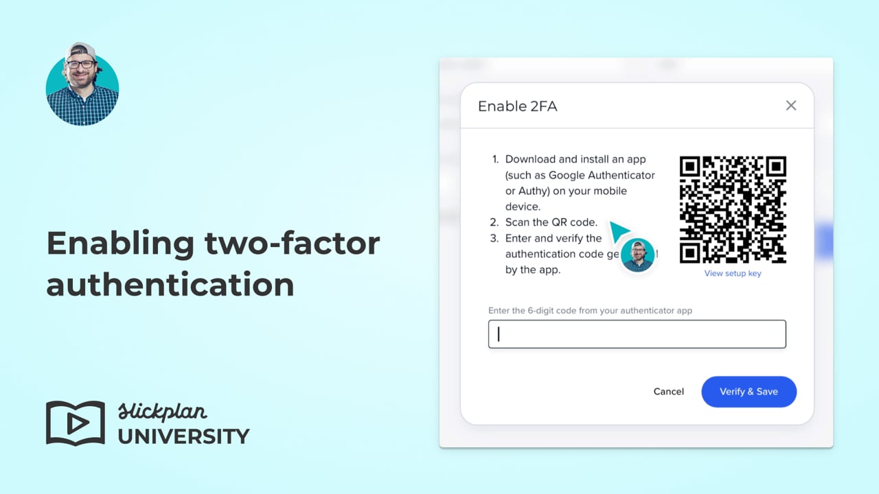 - Once Slickplan is added, the authentication app will display a 6-digit code. Enter the code into the modal window. Click Verify & Save.