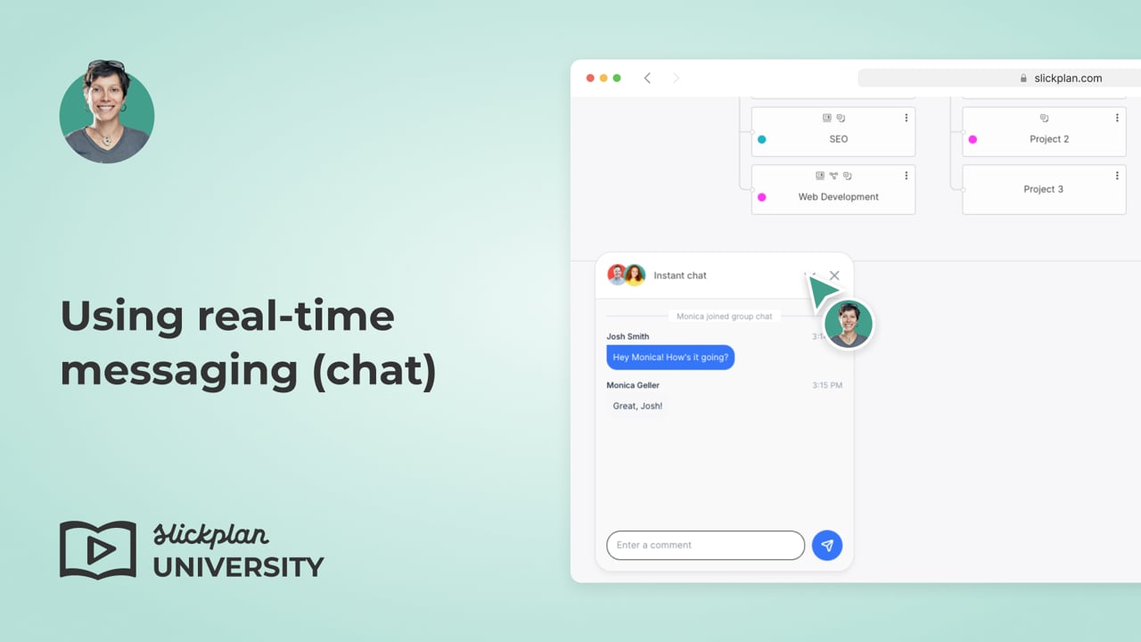 To start a real-time conversation with active team members, click on the chat bubble next to their avatars. A chat window will appear on the lower left side of the screen.