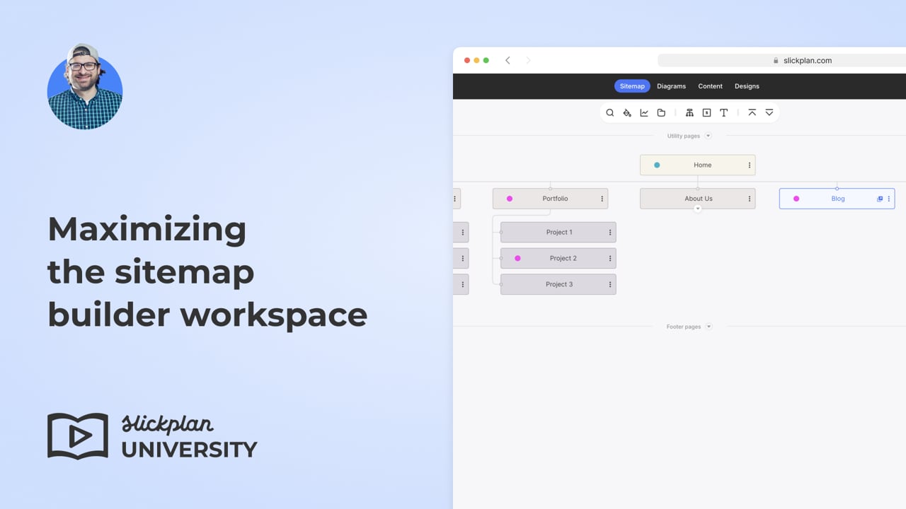 To expand or collapse a branch of a sitemap with child pages, click the upward or downward arrows at each page’s bottom.