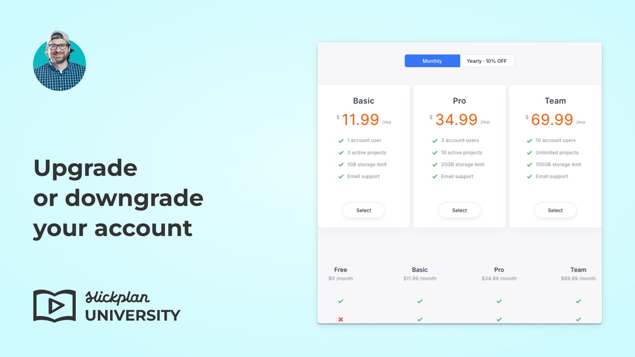 - Here, you can manage your subscription: upgrade or downgrade your plan, update payment information, and switch between monthly and annual subscriptions.