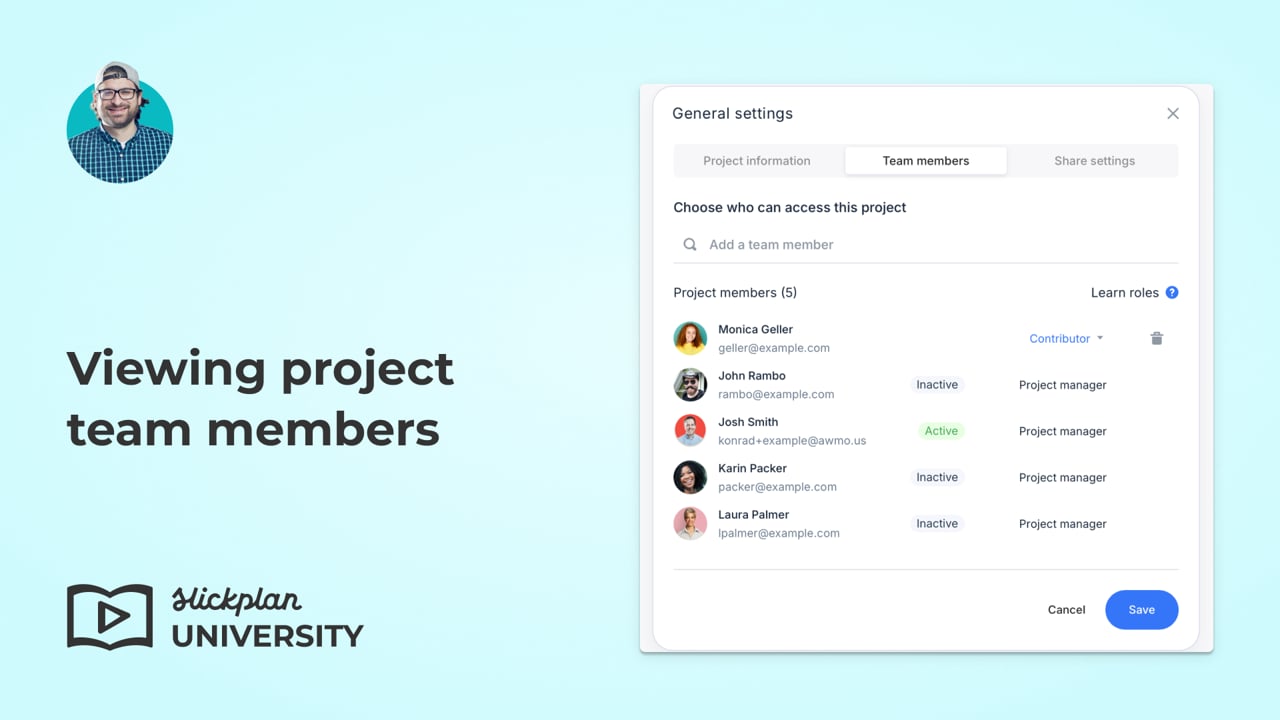 You can also see and modify the list of team members by opening a project and going to the project General settings. Click the Team members tab to see everyone.